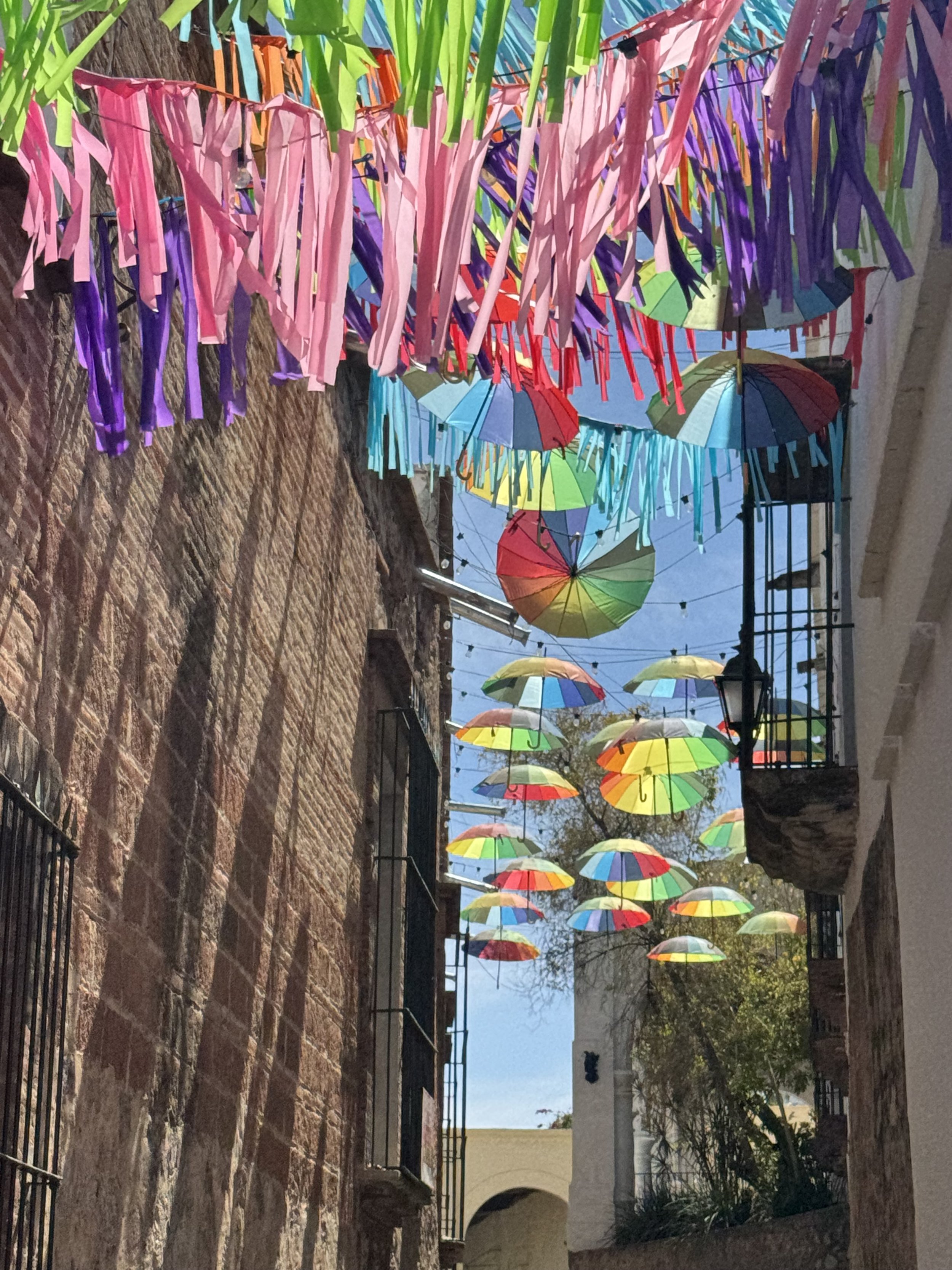 On our return visit in January 2025 the town was alive with thousands of visitors from around Mexico for the Festival Alfonso Ortiz Tirado (FAOT) music festival. The annual festival features over 700 artists and bands from Mariachis to Opera. The town was newly decked out in hundreds of colorful streamers, flags and rainbow-colored umbrellas.