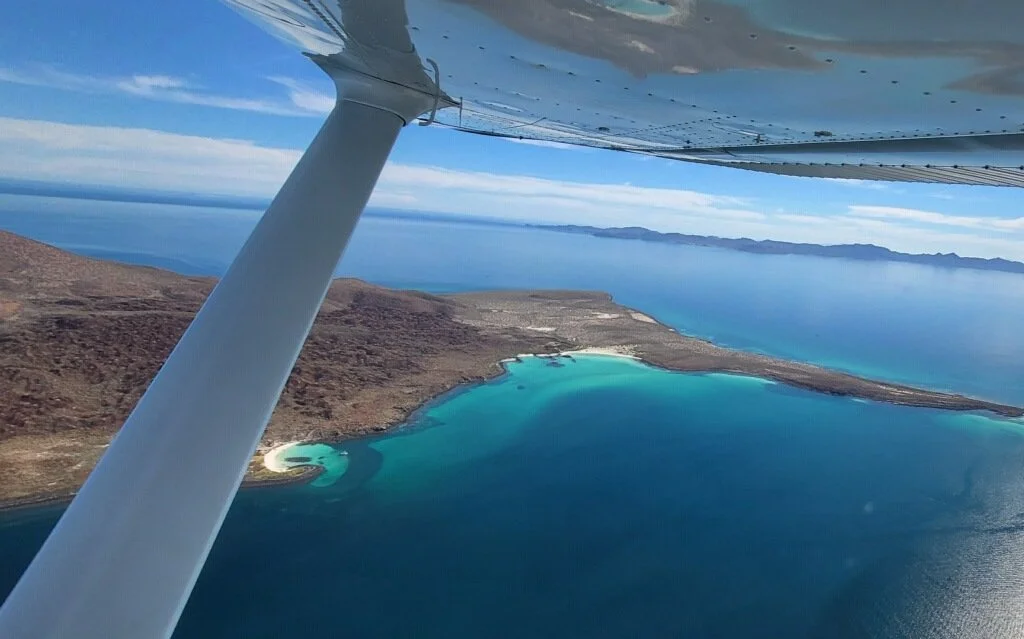 Striking moments continue as we soar high over the vast shades of the plants of the Sonoran Desert and bright striking blues of the Sea of Cortez. A quick stop in Loreto for fuel we are off again banking steeply out over the Sea and then fast and high to clear the craggy mountains of Baja California Sur.